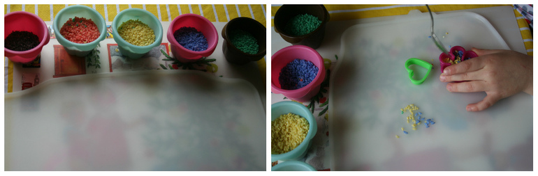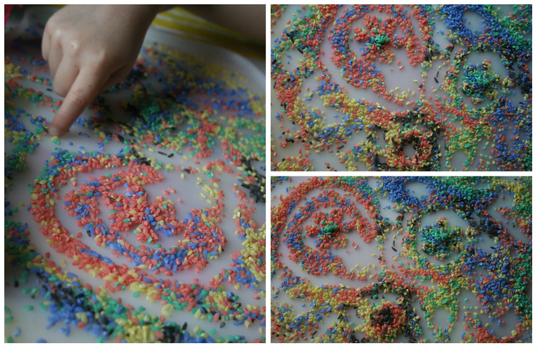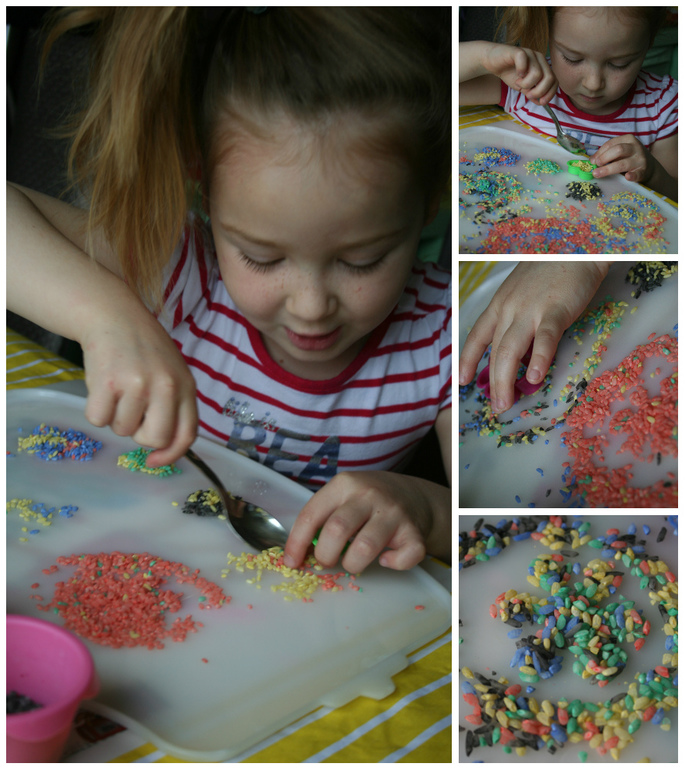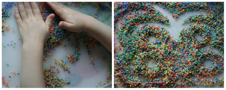 Началось все с цветного риса, белого подноса, пары формочек для пластилина и полной свободы в действиях.