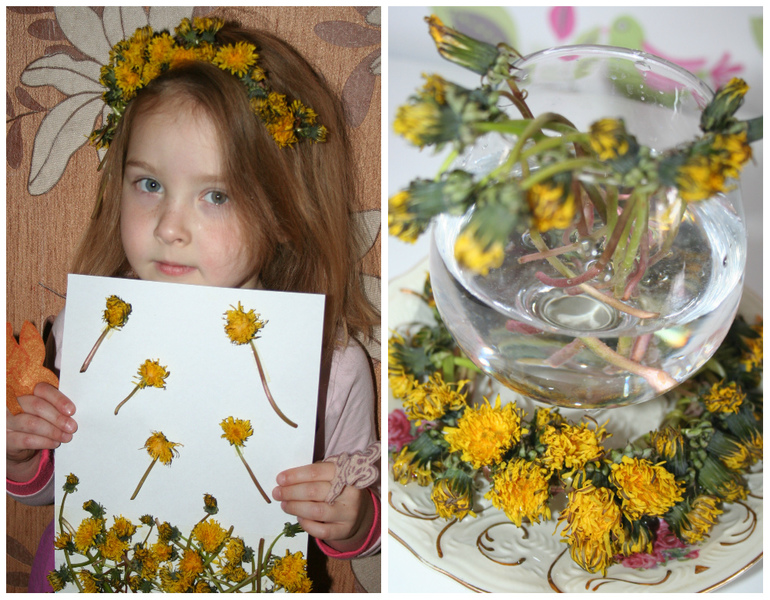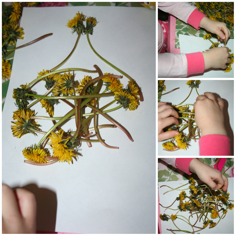Еще один необычный способ зд-творчества мы опробовали, вдохновившись невероятно красивыми и необычными картинами . И набрав целую гору одуванчиков принялись творить. Сначала Камилка самостоятельно экспериментировала с новым материалом...
