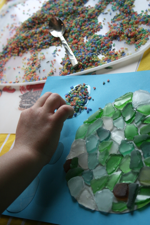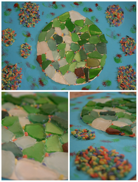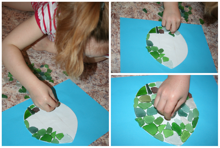 А получившийся радужный рис можно потом использовать и в других поделках, как например, сделали мы, украшая пасхальную картинку. Хотя главным в ней был все-таки далеко не рис, а стекло! Одно из преимуществ проживания на морском побережье - отшлифованные стеклышки, которых мы набрали целую кучу, чтобы реализовать давнюю задумку. Мне очень хотелось сложить мозаичный пазл из стеклышек, и Камилка с удовольствием подхватила эту затею. А поскольку творили мы накануне Пасхи, то от образа яичка никак не могли отказаться. Крепили все детальки на двухсторонний скотч.