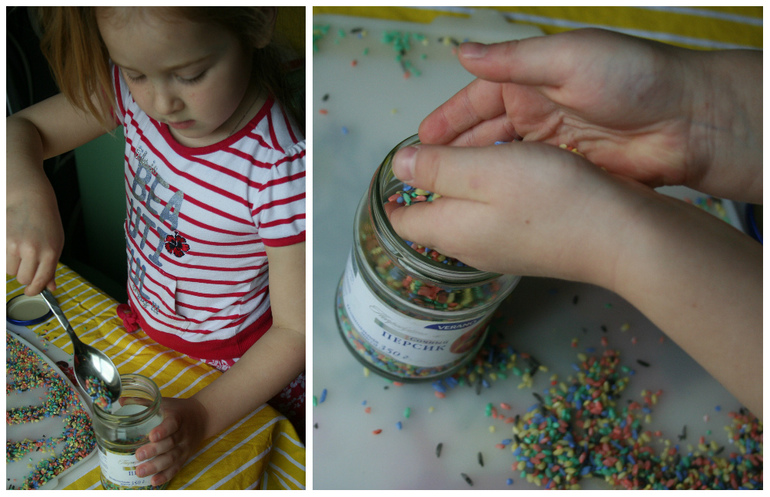 Все просто до банальности, но именно такое рисование действительно очень надолго увлекло Камилку. Обычно она пробует что-то новое, совсем недолго с ним экспериментирует и теряет интерес, а тут заинтересовалась по-настоящему и долго-долго рисовала, пока полностью не смешала все цвета. Сначала ее увлекли формочки и их заполнение цветными рисинками с помощью чайной ложки...