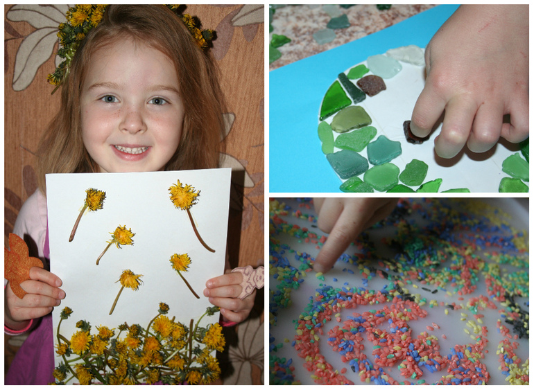 ЗД-рисование: живые цветы, цветной рис, стеклышки.