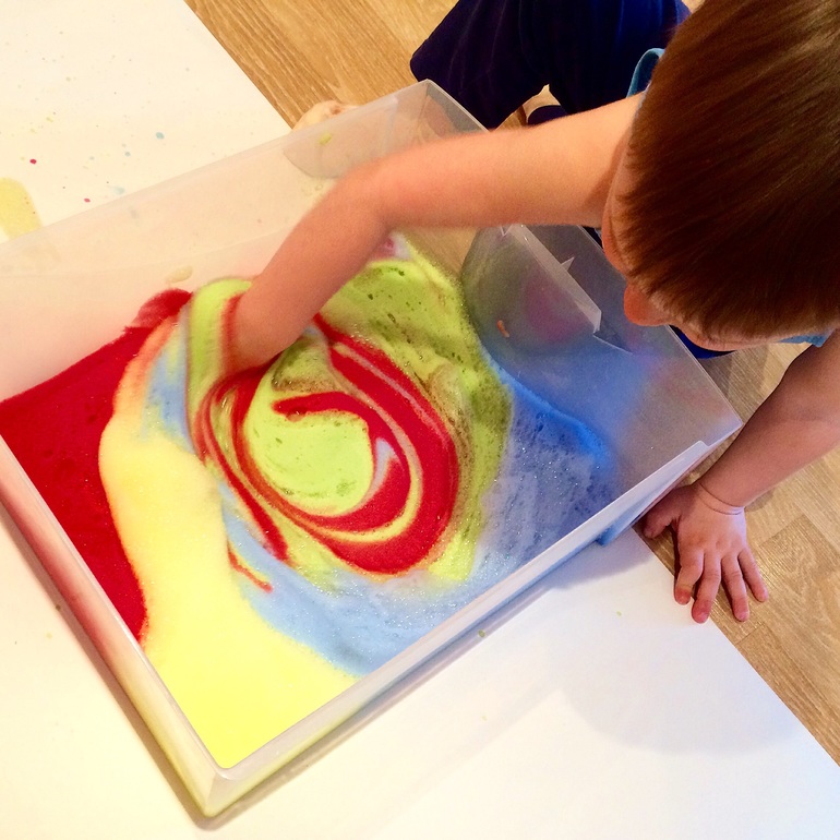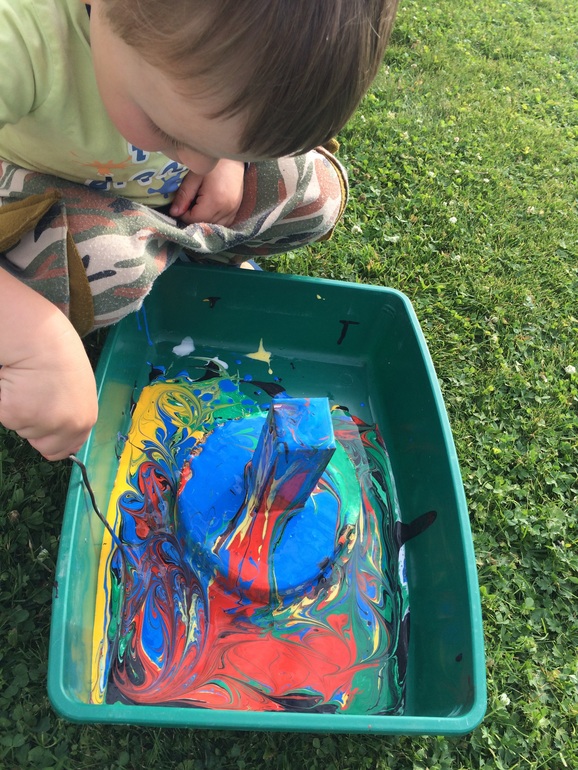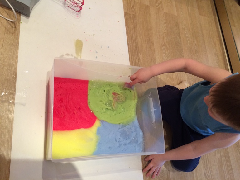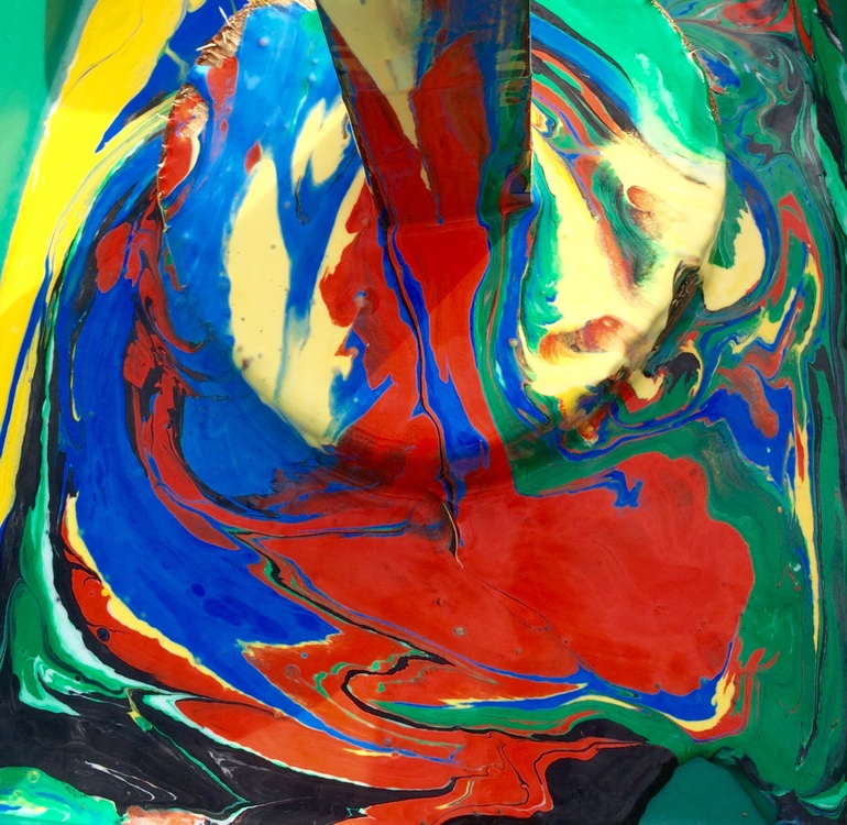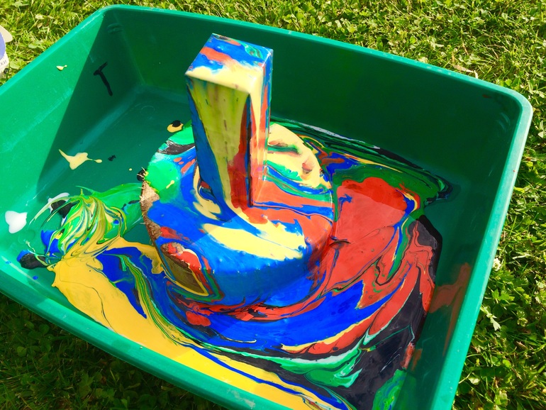 Развели акриловые краски клеем ПВА для большей текучести. Соорудили башню и поливали на нее краски. Получающиеся сказочные узоры завораживали.