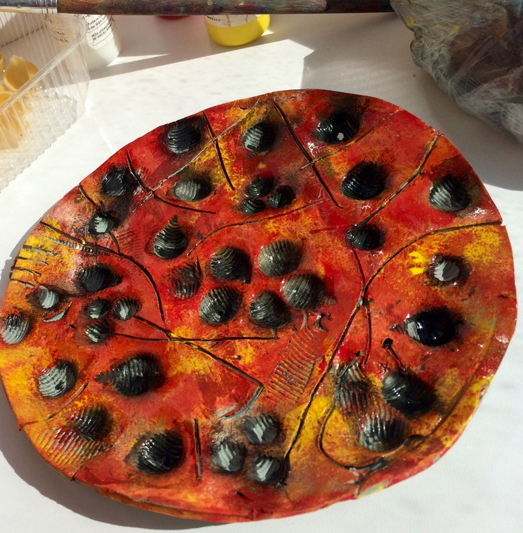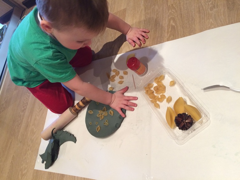 Мы выбрали сложную технику. Взяли глину, с помощью разных макарон отпечатали рисунки