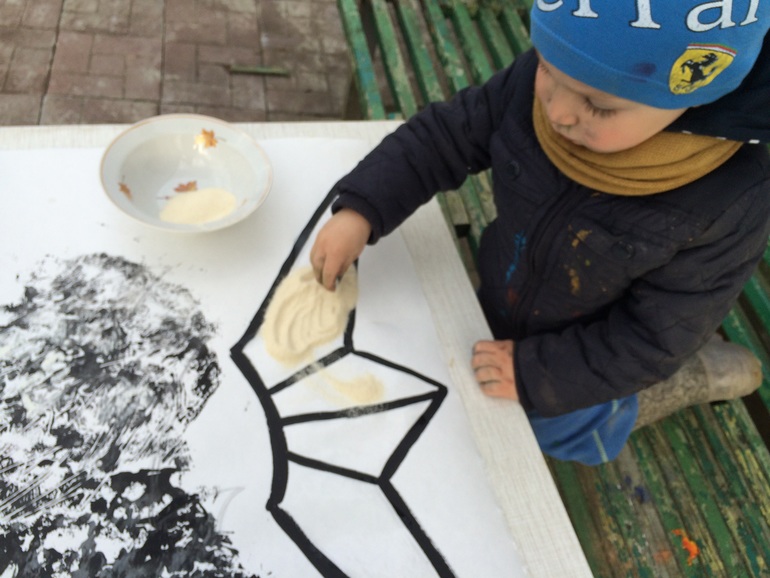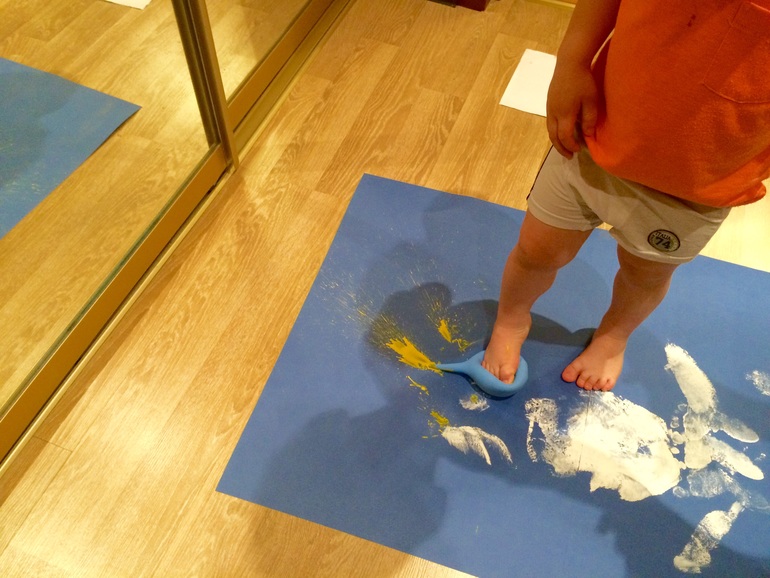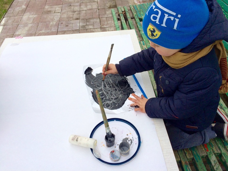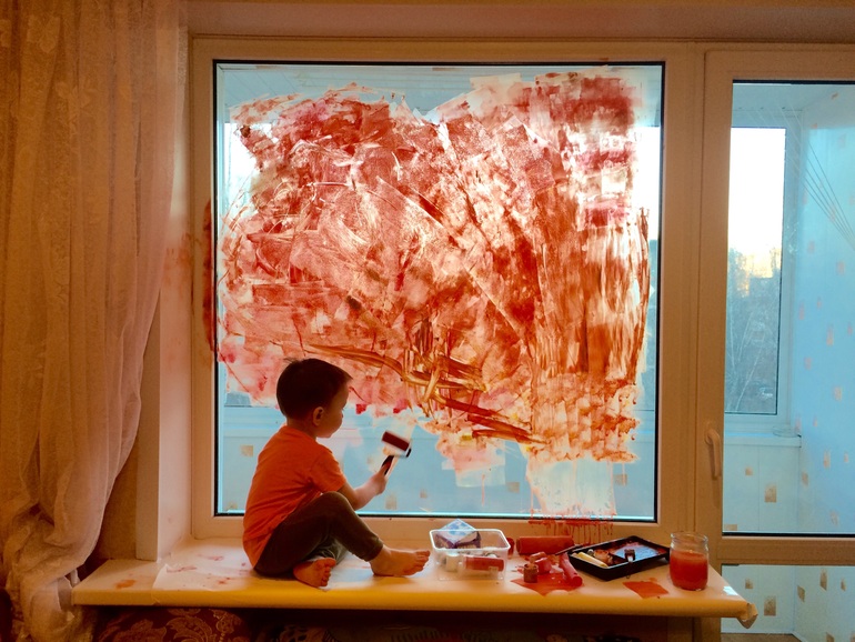 Мы, конечно, много где рисовали и на больших форматах на полу, и на больших форматах на стене , и на зеркале, но на окне в таком большом формате еще не рисовали, тем интереснее было Яру.