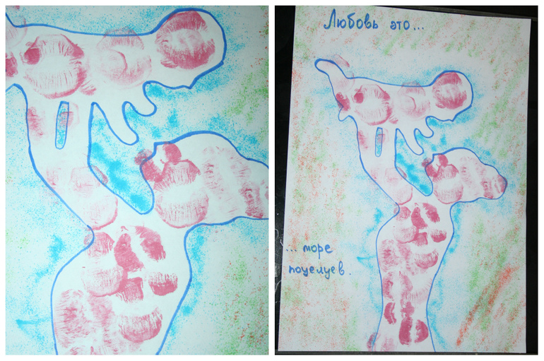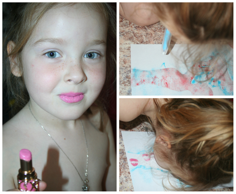 Сказать, что Камилке понравился такой необычный способ творчества, это ничего не сказать! Она буквально пищала от восторга! Еще бы накраситься маминой помадой, а потом оставлять поцелуйчики - ни одной девчонке не устоять :-) Думаю, эта идея пригодится нам и в будущем для поздравительных открыток!