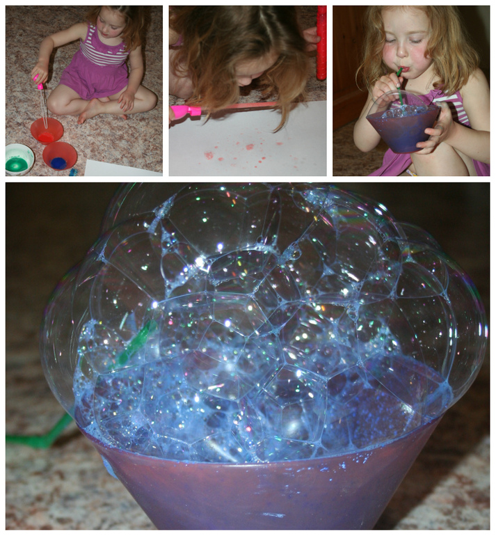 Второй способ рисования без рук, который мы попробовали - это выдувание мыльных пузырей. Тоже занятие невероятно увлекательное и красочное! Камилик увлеклась не на шутку!