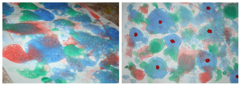 Я купила мыльные пузыри и разлила их в три емкости, которые покрасила гуашью в выбранные Камилкой цвета: синий, красный и зеленый. Изначально предполагалось, что мы будем выдувать подкрашенные пузыри прямо на холст, но стоило только покрасить мыльную жидкость, как пузыри больше не получались. Но мы не растерялись, взяли коктейльную трубочку и начали создавать пышные замки из пены, по которым хлопали листом бумаги получая отпечатки. Но и этого нам показалось мало и тогда вооружившись ложкой мы нашали выкладывать пену на бумагу густым слоем.