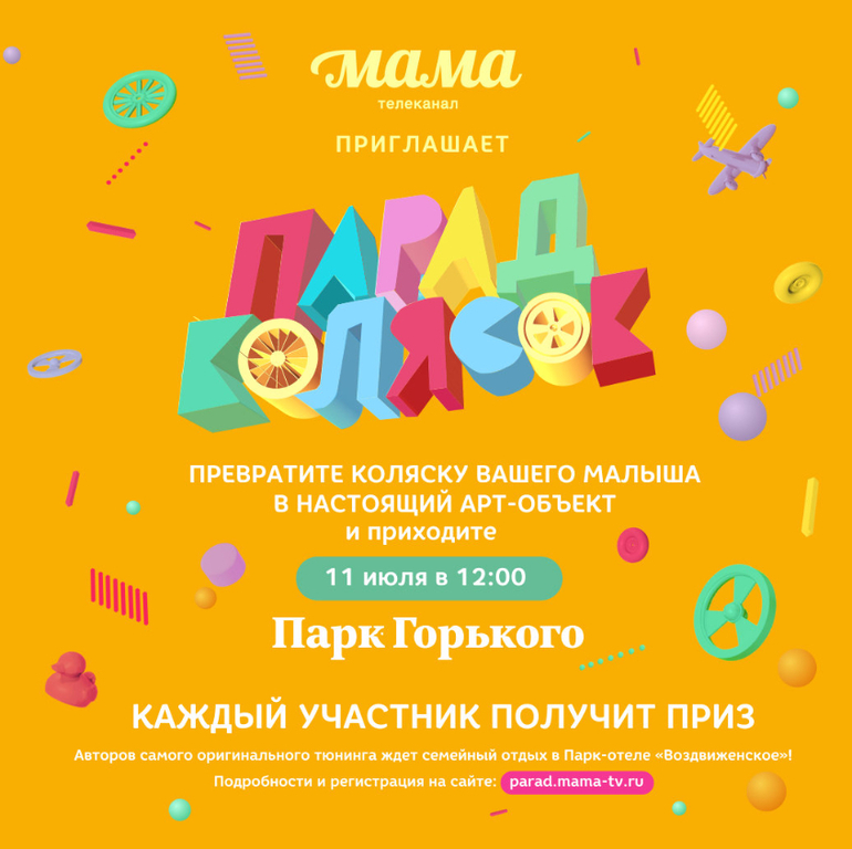 11 июля телеканал «МАМА» организует традиционный семейный праздник - костюмированный «Парад Колясок», который состоится на территории центрального парка Москвы (ЦПКиО им.Горького). В этом году «Парад колясок» приурочен к всероссийскому «Дню семьи, любви и верности». Начало праздника в 12:00.