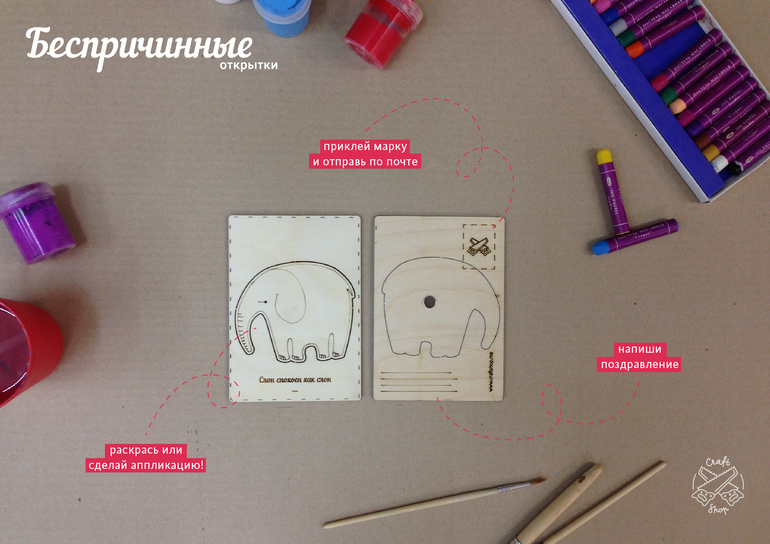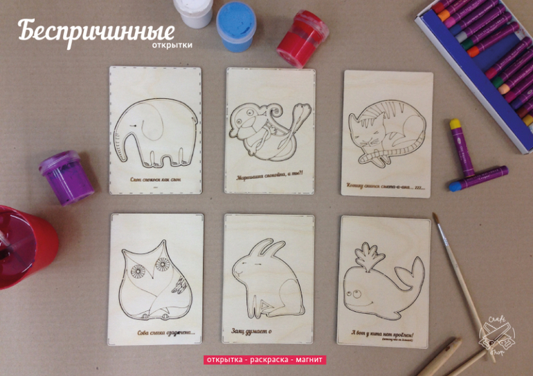 Беспричинные открытки выполнены из фанеры высшего сорта, абсолютно экологичны и подходят для раскрашивания любыми художественными средствами.