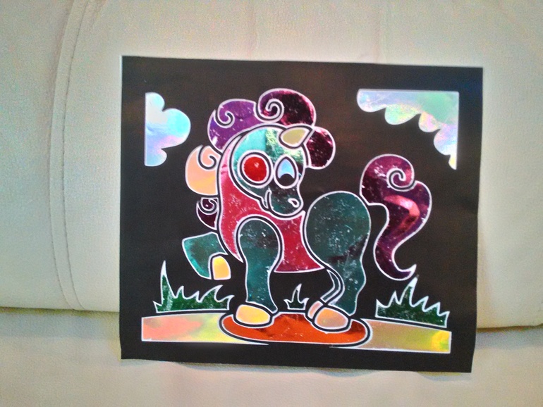 Достаем картинку, отклеиваем защитную пленку и прикладываем фольгу, проводим пальчиком для лучшего склеивания и отрываем. Ребенок мой легко со всем справлялся, я только подсказывала куда какой цвет клеить и помогала, когда требовалось отклеить очень мелкие детали.