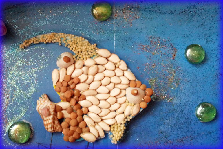 Мы с дочей стандартно мыслить не можем, нас всегда тянет на эксперименты. Поэтому в этом году мы решили сделать не из привычных каштанов и желудей, а из ракушек. Предварительно запаслись ими летом. Какие то покрасили, какие оставили в естественном виде, так же использовали перья (тоже красили), крупы, чечевицу, семечки тыквенные, горох, фисташки. Из НЕ природного - блестки, декоративные капли (камни прозрачные), постер на котором нарисован затонувший корабль и риф.