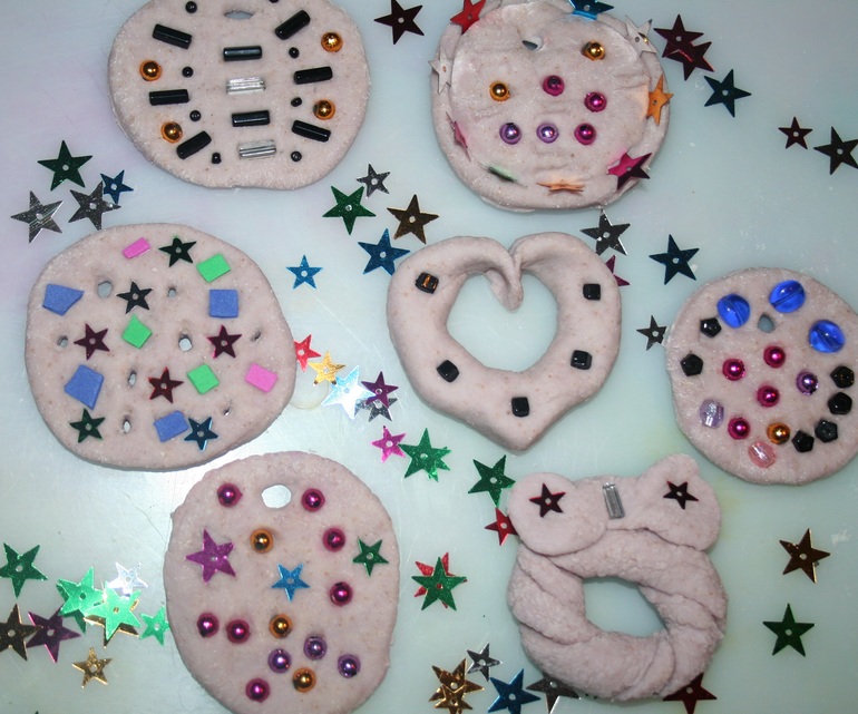 Из него очень удобно лепить различные фигурки и играть с ним в кондитерский магазин, украшая различными бусинками, камушками и крупами. Мы с Камиком решили сделать елочные украшения.