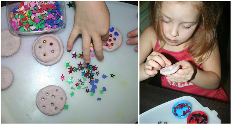 И хотя наши мечты о новых елочных игрушках не сбылись, мы не стали грустить по этому поводу. Камилка забрала лепешечки с бусинками, которые были потолще, к себе на кухне, сказав, что давно мечтала о таких нарядных печеньях. А я рассматривая ломкие кусочки придумала отличную мелкомоторную забаву. Поскольку тесто застывает очень быстро и ломается легко, в него можно прятать какие-нибудь небольшие подарочки или записки с секретиками. Наделать например шариков 10 и только в один положить что-нибудь особенное и пусть ребенок с ними расправляется. Мне кажется особенно весело будет устраивать расправу при помощи пластмассового молоточка :-) Одно из заданий на предновогодний адвент у меня уже готово :-) Сделаю белое тесто и будут почти снежки :-) На этом пока все! Буду рада, если рецепт пригодится для игр, забав и веселых сюрпризов!