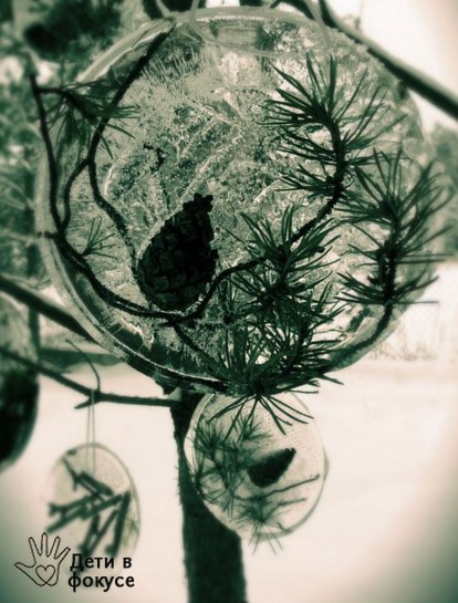 Украшать можно не только дом и домашние елки. И не только под Новый год. Это можно делать в любую хорошую погоду. Сделайте простые и красивые украшения изо льда: просто положите в пластиковые тарелки разные природные материалы - шишки, веточки, хвою, и залейте водой. Ой, не забудьте еще петельку из веревочки или резинку вложить с краю, чтобы было за что подвесить готовый ледяной диск. Украсить ими можно деревья на улице, во дворе дома, в парке, в лесу.