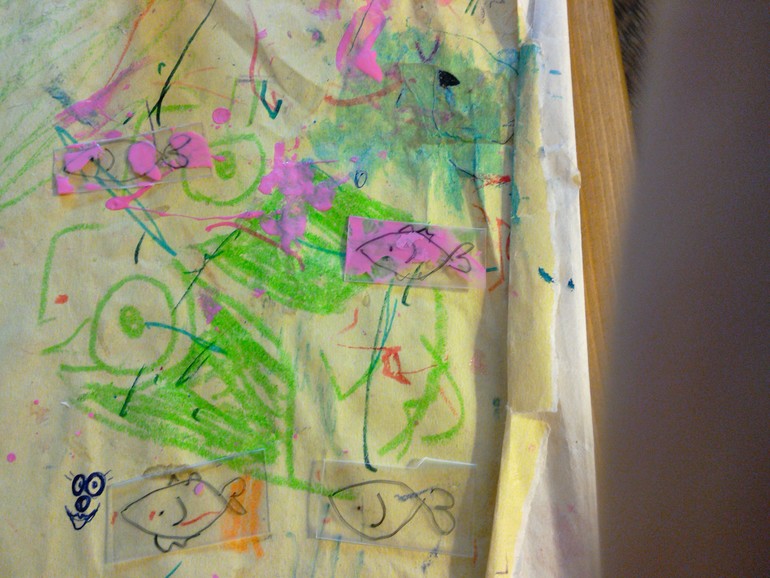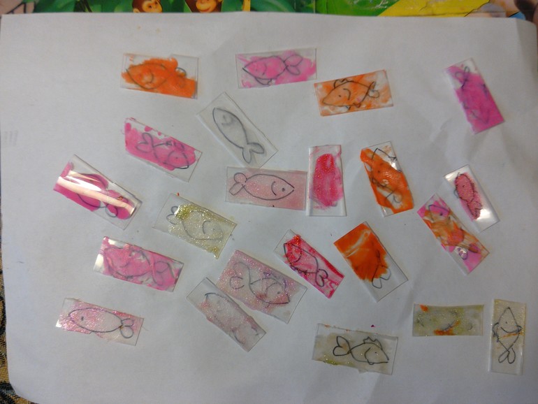 Ломаем пластик и рисуем на кусочках рыбки, рыбок сразу передаем на раскрасску
