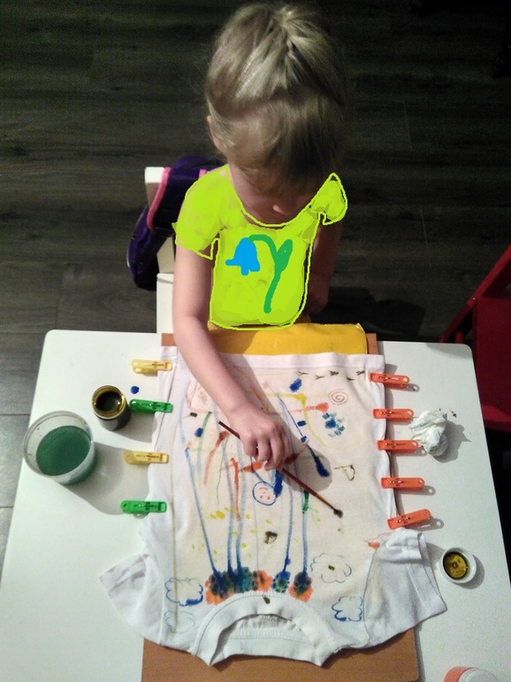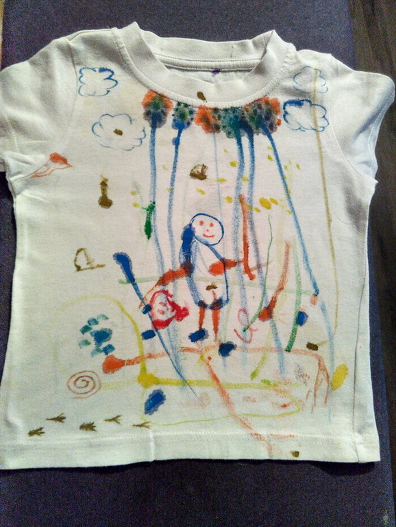 Галерея живописиНе смогла отстирать детскую белую футболку, поэтому решила превратить её в дизайнерскую вещь. Дочка с удовольствием рисовала красками по ткани, испытывая невероятный кайф просто проводя линии на ткани и оставляя на ней следы краски. Это первый дочкин опыт рисования на одежде. Я не удержалась и тоже немного порисовала на Дашиной футболке.