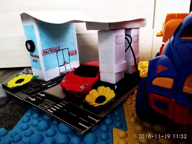 В нашей коллекции игрушек из картона прибавление - бензозаправка. Она просто необходима при таком количестве машин, как у нас)) На этот раз в дело пошли коробки из-под соков и пакетики из-под них же.