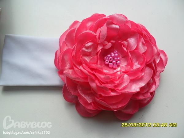 Да, повязочки есть, какого цвета цветок вас заинтересовал? Стоимость 35 грн., от вас требуется обьем головки вашей принцессы, чтоб уж наверняка!!!