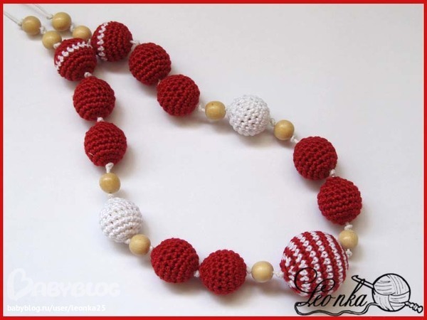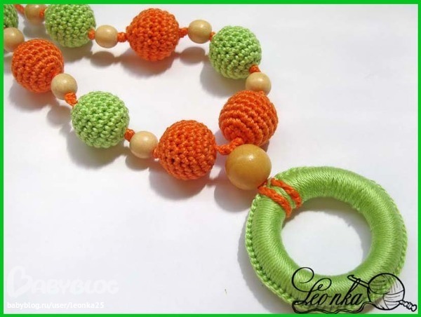 Для мамы - украшение. Для маленького ребёнка - игрушка. Малыш может перебирать их ручками, грызть и т.п. А не мамины волосы, цепочки, серёжки... Хорошо занять ребёнка в очереди, в поликлинике, во время кормления и т.п. Когда ребёнок находится на руках, в слинге, рюкзаке....
