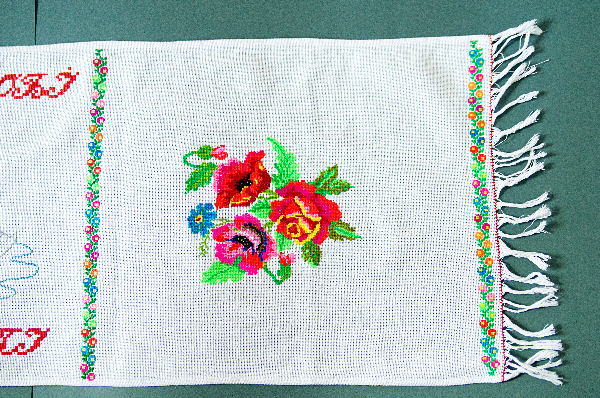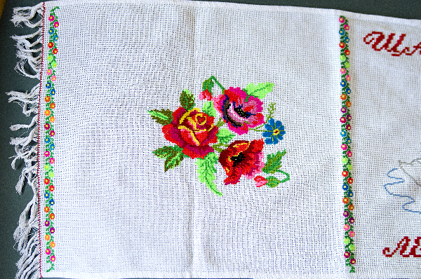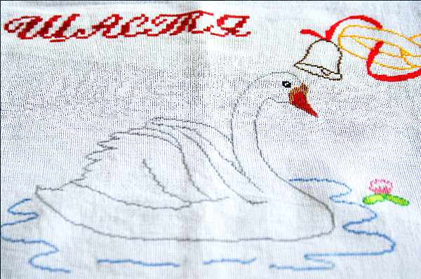 Вышито аккуратно крестиком, цветными нитями на белой, мелкой канве.