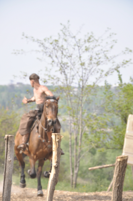 Представление интересное. Видно, что ребята тратят много времени и сил на подготовку, их кони в шикарном состоянии. Таких красивых ухоженных коней я еще не видела. Представление состоит из демонстрации традиционного оружия казаков, рассказа о нем, демонстации владения оружием, стрельбы из лука с положения стоя, лежа и с коня на скаку, выхватывания оружия у противника, скачек друг за другом в седле и свесившись с него и т.д. После представления можно прокатиться на лошадке, если не ошибаюсь, еще за 10 грн. Если честно, использования именно коней было маловато. Ну я решила - может, это будничное представление.