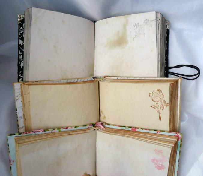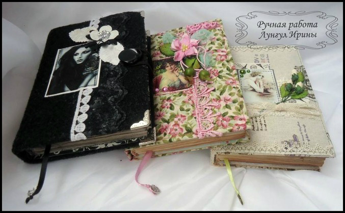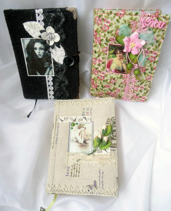 Блокноты А-6 формата.по 120 тонированных в кофе и проштампованных листиков, черный блокнот застегивается на пуговичку,ткань "тепленькая".у остальных два-обложка-ткань-100% хлопок.В каждом блокноте на форзацах удобные кармашки для записок.