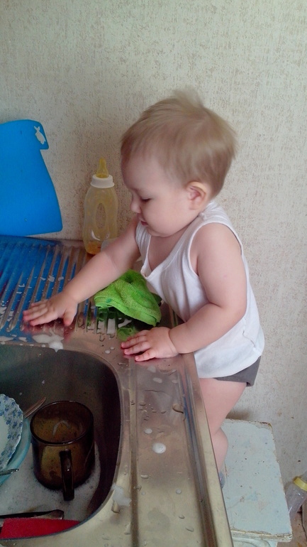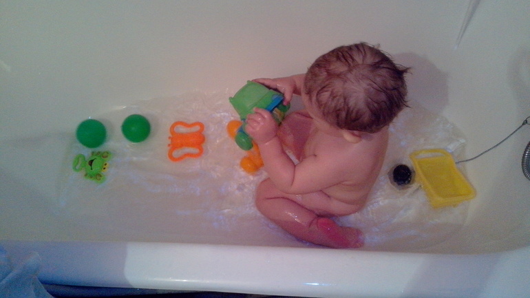 пока мылись три разв спускали и набирали воду, расплескал воду по всей ванной устроив потоп и пищал от радости когда пукнул в воде))) воду он любит очень сильно и сам научился нырять под воду а мама всегда бдит,
