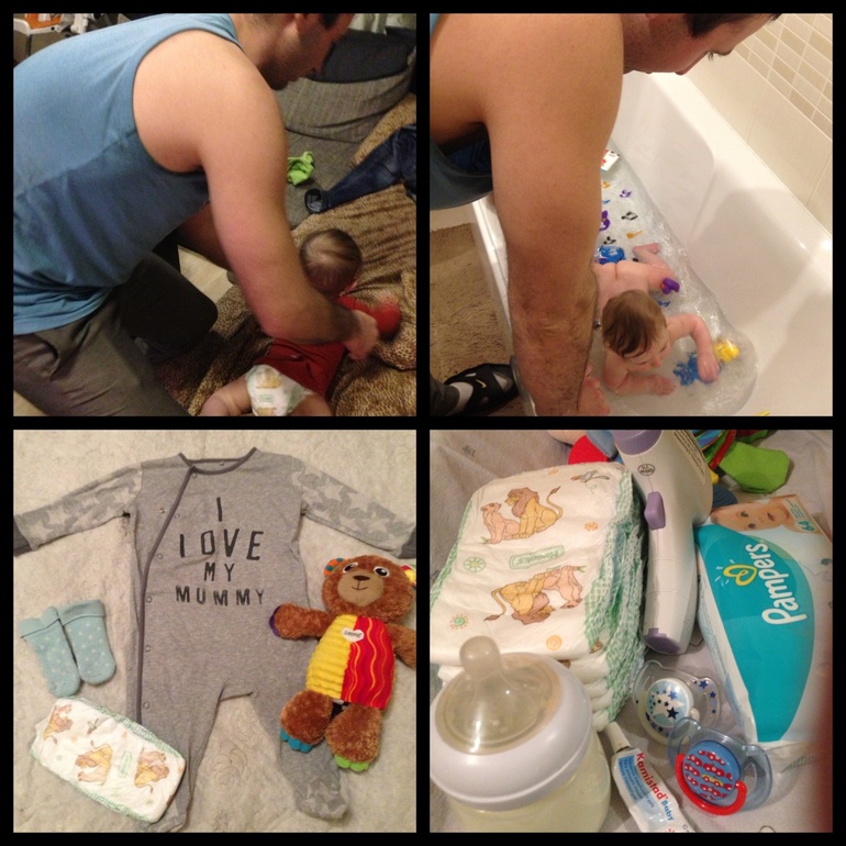 Папа идёт купать сыночка, мама подготавливает всё ко сну)