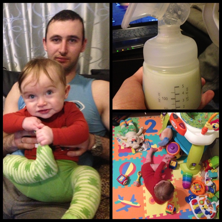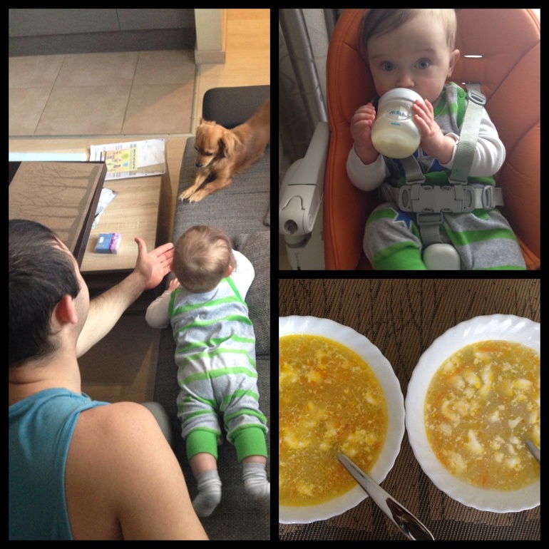 Папа-муж развлекает сына( и пёсика), я разогреваю супчик и даю Максимке молочко)