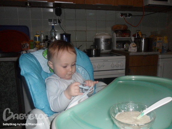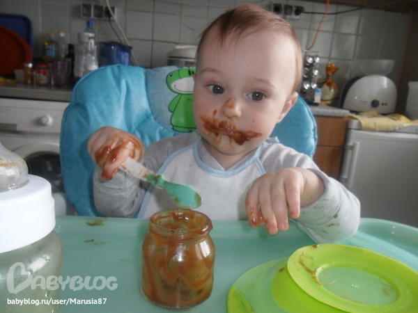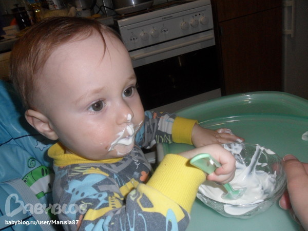 Учимся кушать сами...И смотрим Машку и медведя (очень любит этот мульт)..