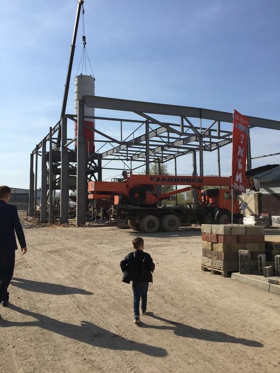 Поехали на работу. На месте пожара сначала все разгребли, образовав поле, потом стали строить и сегодня возили Мишу и Захара смотреть как 70-тонный кран монтирует силоса.