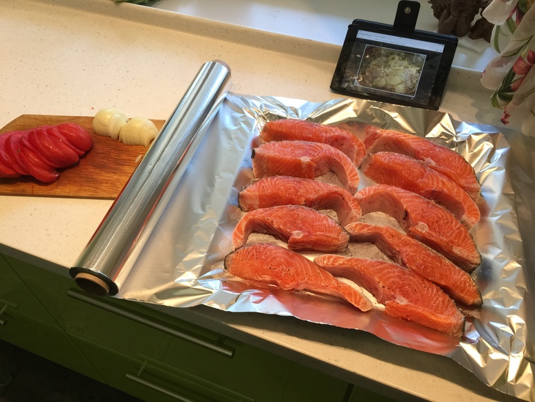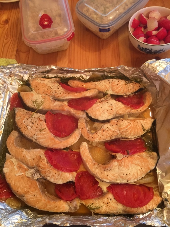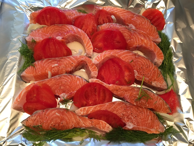 Получилось вот так. Считаю, что если не хочешь испортить рыбу, то ее надо посолить, поперчить, лук и помидора и все. в этот раз для аромата вокруг положила укроп.