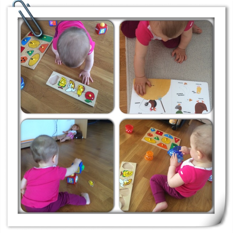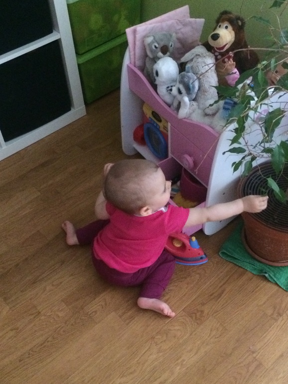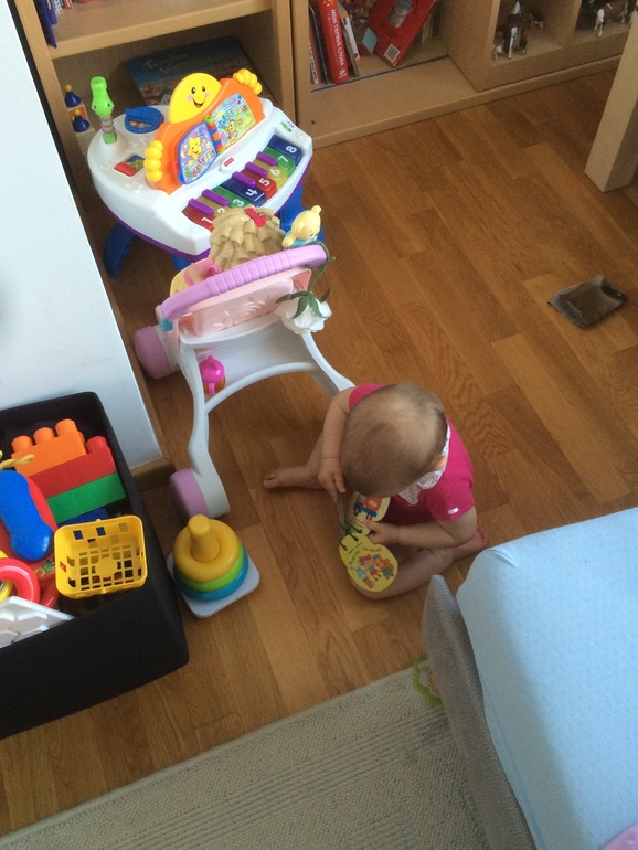 Проснулась в 18.30-это ооочень поздно, но день сегодня такой! Немного играет сама, пробралась в комнату старшей, пока ее нет можно и по интересным шкафчикам полазить.