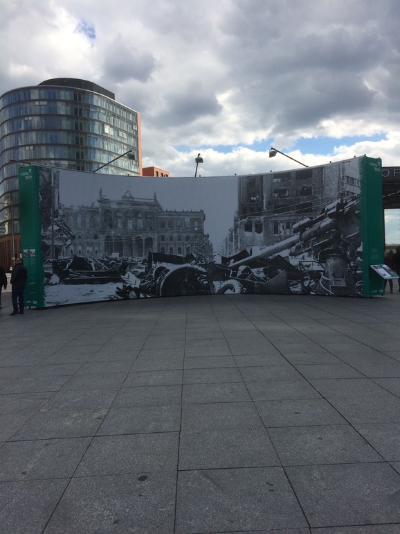 Немцы тоже "вспоминают" 8 (9) мая. На всех крупных площадях стоят вот такие фото ,как это место выглядело в1945 году.