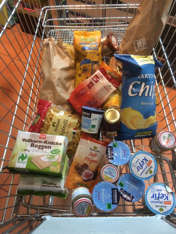 Купила только то,что продается именно в этом магазине-йогурты, кефир, хлебцы, лимонад, сухофрукты, мюсли и фрукты немного.