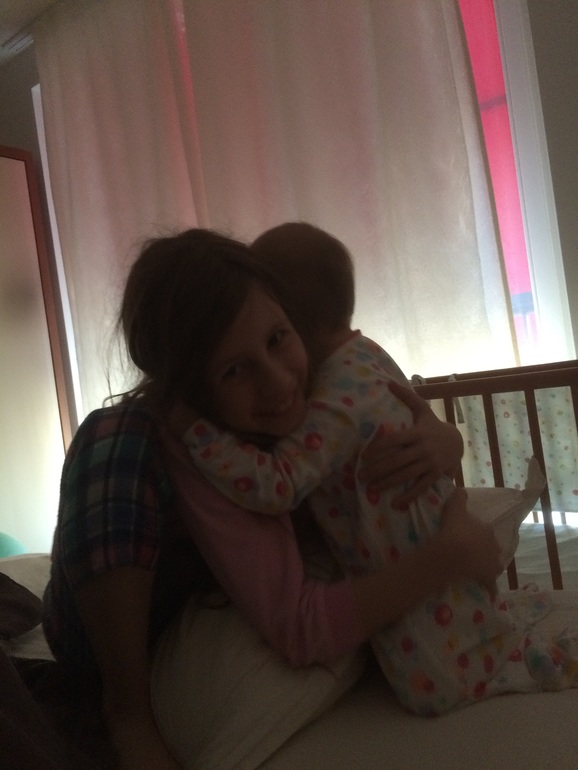 Услышав,что мы проснулись, прибежала старшая. Утренние обнимашки! За окном светло, просто опущены жалюзи)
