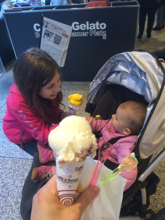 В 15.45 забираем старшую и, как и было ей обещано, идем есть итальянское мороженое (хотя по режиму пора младшую спать укладывать). Мне и мужу с карамелью, старшей -лимонное с базиликом. Младшей достался кусочек вафельного рожка.