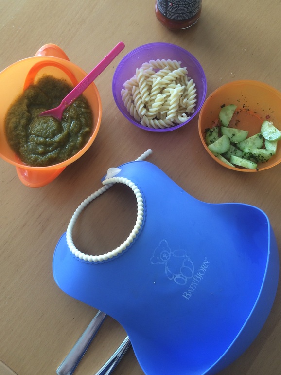 Основное блюдо -овощное пюре, "десерт"-рожки-макарошки и огурцы.