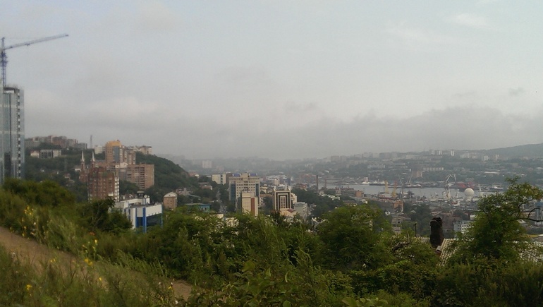 Сама бухта. И вот там далеко, левее белой "свечки", практически посередине, мост уже на Русский остров.