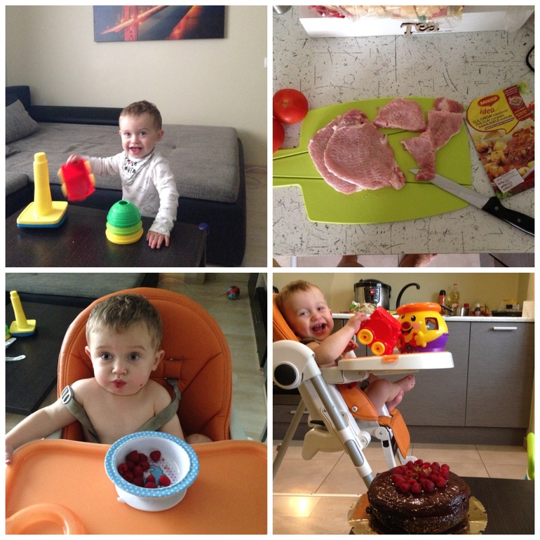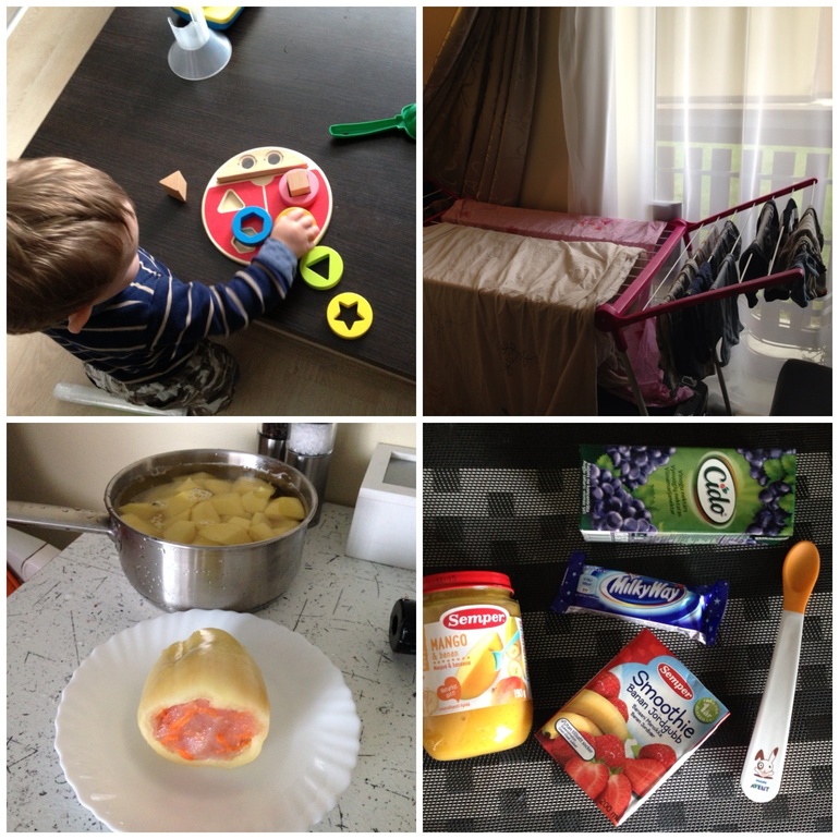 Приходим домой Максик захотел поиграть в свои деревяшки)) А у меня есть время для того чтоб развесить бельё) Готовлю Максу перчик и нам чищу картоху) Так же собрала для Макса ( и себя) полдник( думали после сна поехать в центр погулять).
