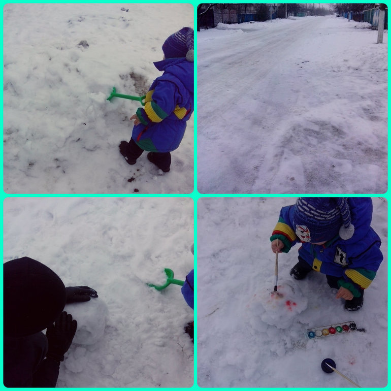 На улице с папой мы лепим снеговичка - рушим и снова лепим, и снова рушим. Прорабатываем детали красками, бегаем друг за другом и уходим домой. Мы домой, а папа обедать и на работу.