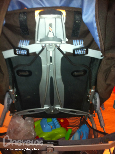 Вид спинки сзади, нигде ничего не сломалось, не погнулось, хотя даже на разложенной спинке в 170гр я катала по 5 огромных сумок продуктовых и даже в икею ездили все в коляску сваливали, в том числе и полки деревянные, шкафчики..че тока не возили))