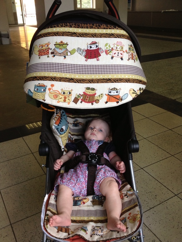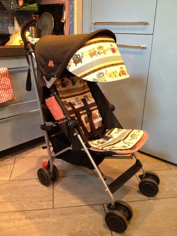 Стали мы в честь предстоящего отпуска маклареновладельцами, а поскольку мне всегда кажется, что Сашурке будет жарко, а фирма Макларен так не считает, то было решено заказать хлопковый матрасик. Также попросили чудесную мастерицу придумать что-нибудь с капюшоном, а то лежащую детку он как-то слабо прикрывает!)