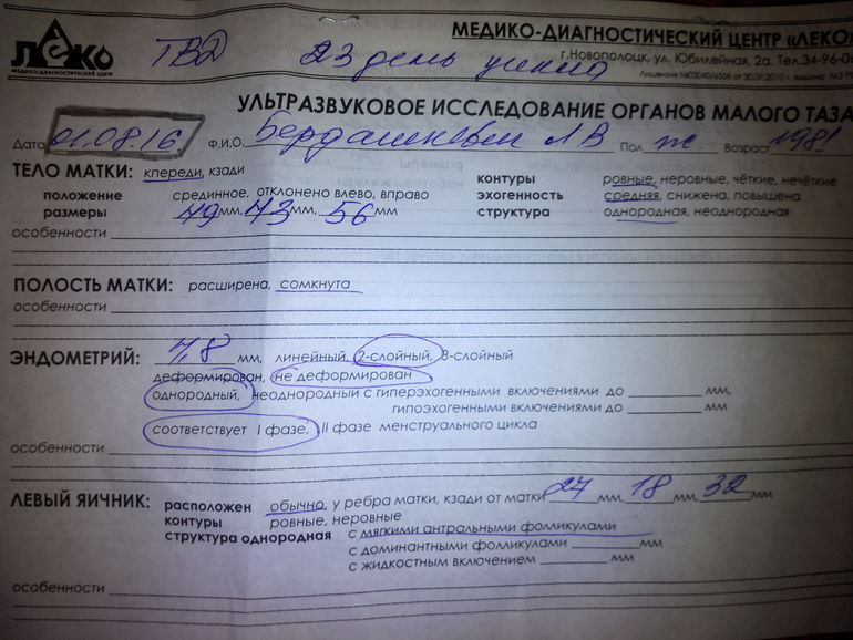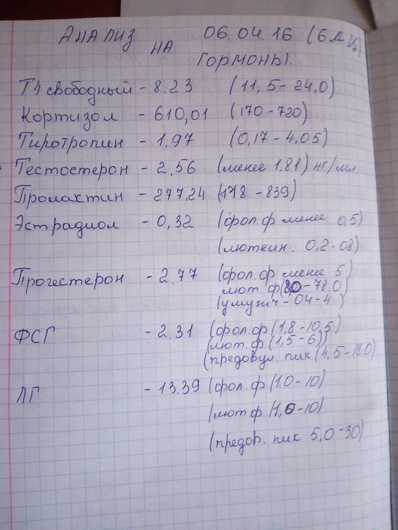 Ну начнут с того что после лапы ,рассечение спаек и резекции я так поняла со слов Г.Поставили закл: хр.эндометрит.Дали нам попробовать самим,прошло пол года,ничего.назначили анализ на гормоны.Врач сказала что норм.Потом 3 м клостик,и ничего по УЗИ начали ставить то аденамиоз,то СПКЯ.То все норм.Затем ещё раз проверка гормонов.После результатов назначили Диане-35 на 2 м.Как закончила их приём снова к ней,она назначает Трибестан на первую фазу,и витамин Е на вторую и уходит в отпуск.А тут у меня такое.Ну вот как то вкратце.