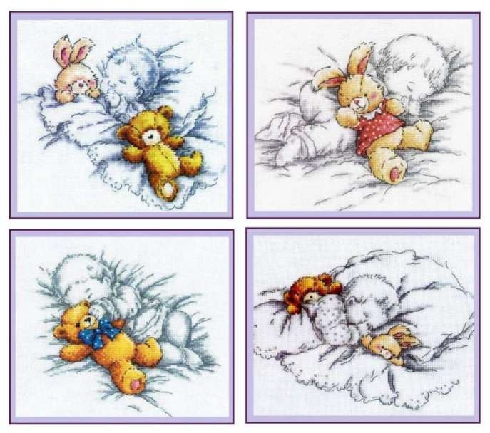 Сынишка и дочурка(изменила цвет платья у зайки) уже заняты) Ищу нижнюю справа. И еще вопрос - А малыша реально вышить в цвете? Хочется чтобы метрики были схожи.
