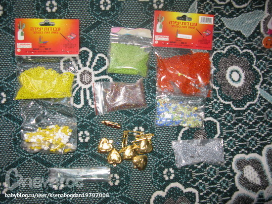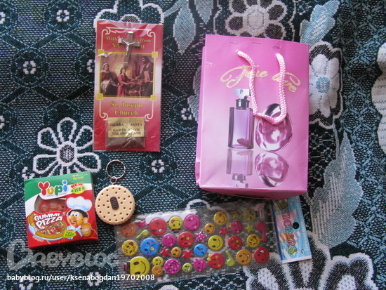 Еще светящийся брелок-печенька, наклейки-которые пока не наклеили-спать не легли! жевательные резинки в форме кусочков пицы(пахнуть абалдеть!) ну и конечно же в пакетике мой слоник - множество красивых бусинок, бисера, заготовки для брошек и золотые сердечки....КАКАЯ КРАСОТА!!!!!!