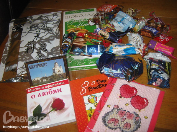 Чай, шоколад, конфеты, магнитик, книжка о любви, диск с романтической музыкой и ОЧЕНЬ красивая валентинка, ручной работы.... с прекрасными стихами.