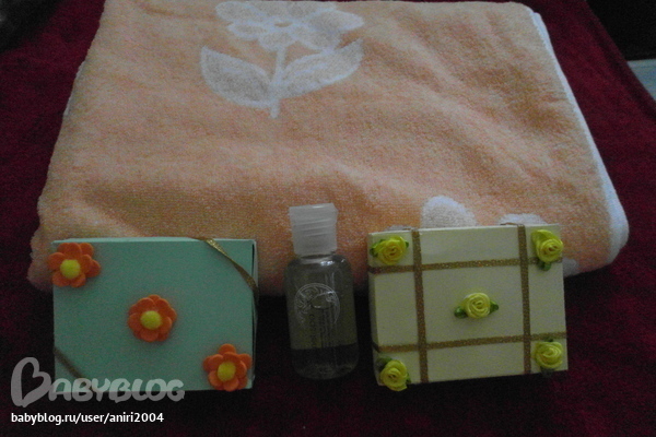 на 8 мрта мне достался вот такой шикарный подарок - огромное пушистое полотенце, две шикарно оформлленные коробочки, в которых оказалось мыло ручной работы и спа-средство для волос с оливковым маслом