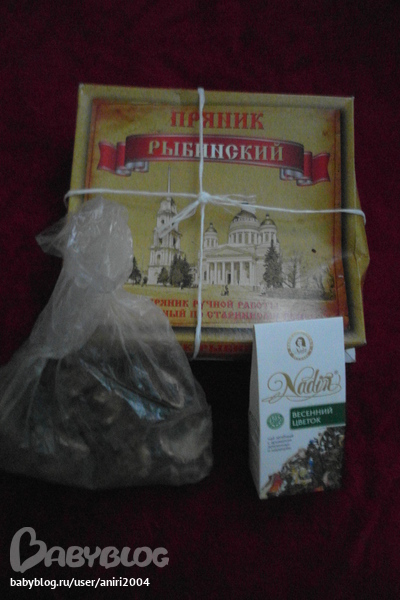 Вот такая вкуснятина досталась моему мужу - чай с потрясающим запахом и пряник ручной работы по старинному рецепту, еще были сушенные грибочки, обязательно сварю из них вкусный суп