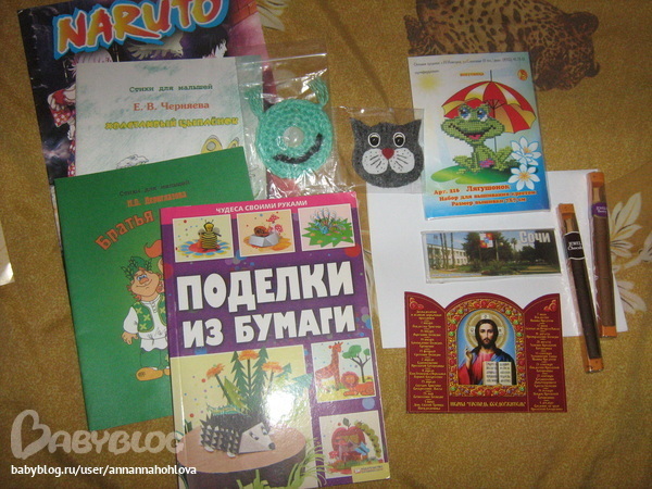 В нем была схемка домика с остаточками ниток (ой как он мне нравится) и мне супер магнитики сделаные Олиными золотыми ручками и наборчик для вышивания. Папе разные сигары он обе уже испробовал восторг как у ребенка, магнитик с сочи, иконка с молитвой перед выходом из дома и мальчишкам книги и раскраска. Вот такая замечательная у нас Оленька. Еще раз спасибо!